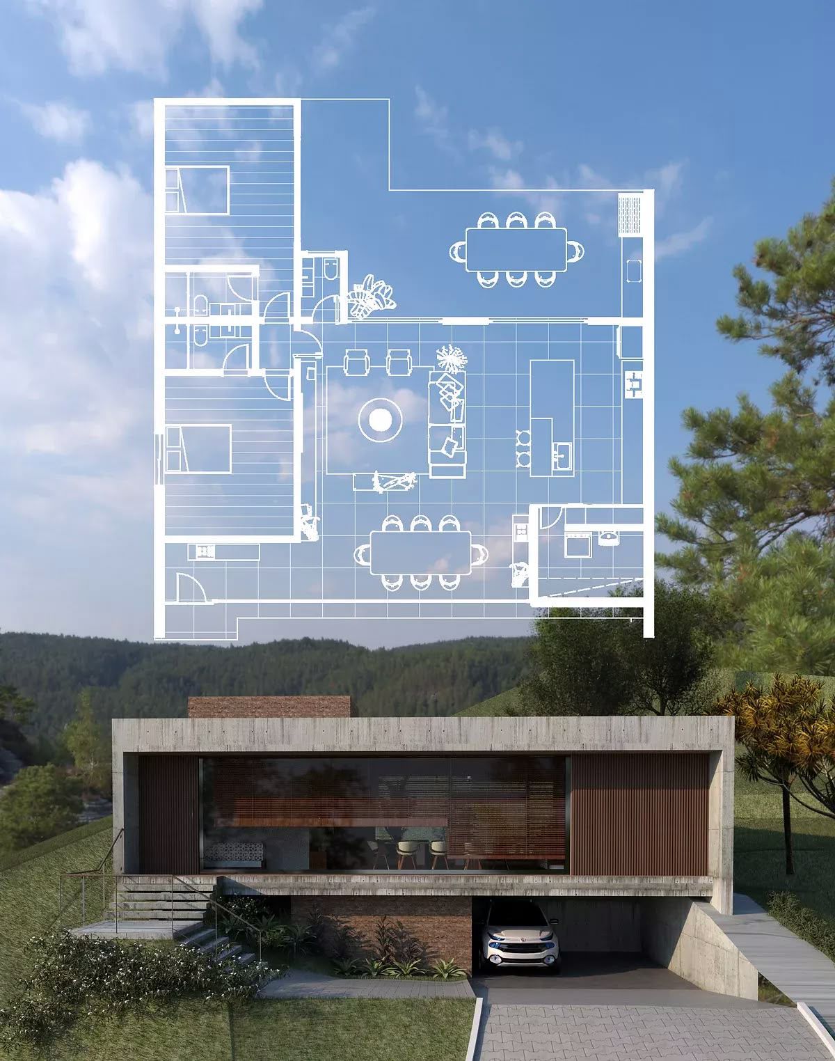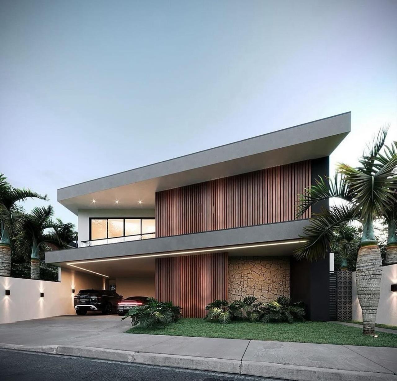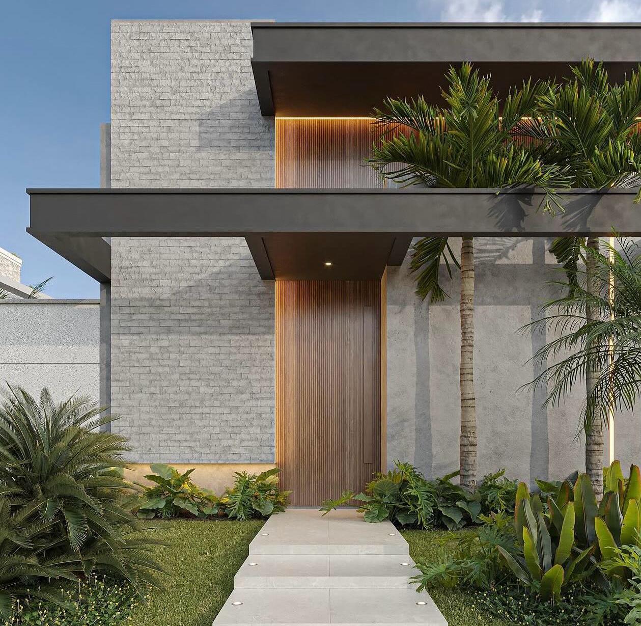 A casa DS é marcada por um design moderno e com linhas retas bem definidas e volumes sobrepostos que criam profundidade e imponência.